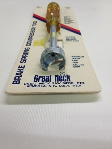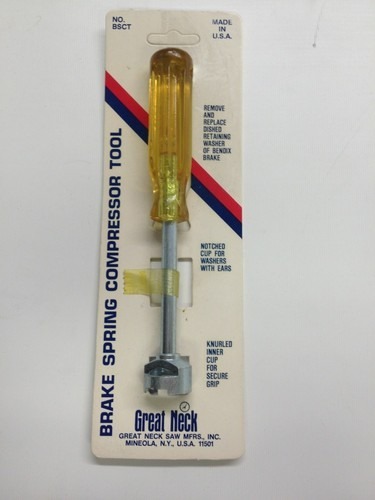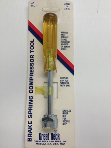 Break spring compressor tool that removes and replaces dished retaining washer of brakes.