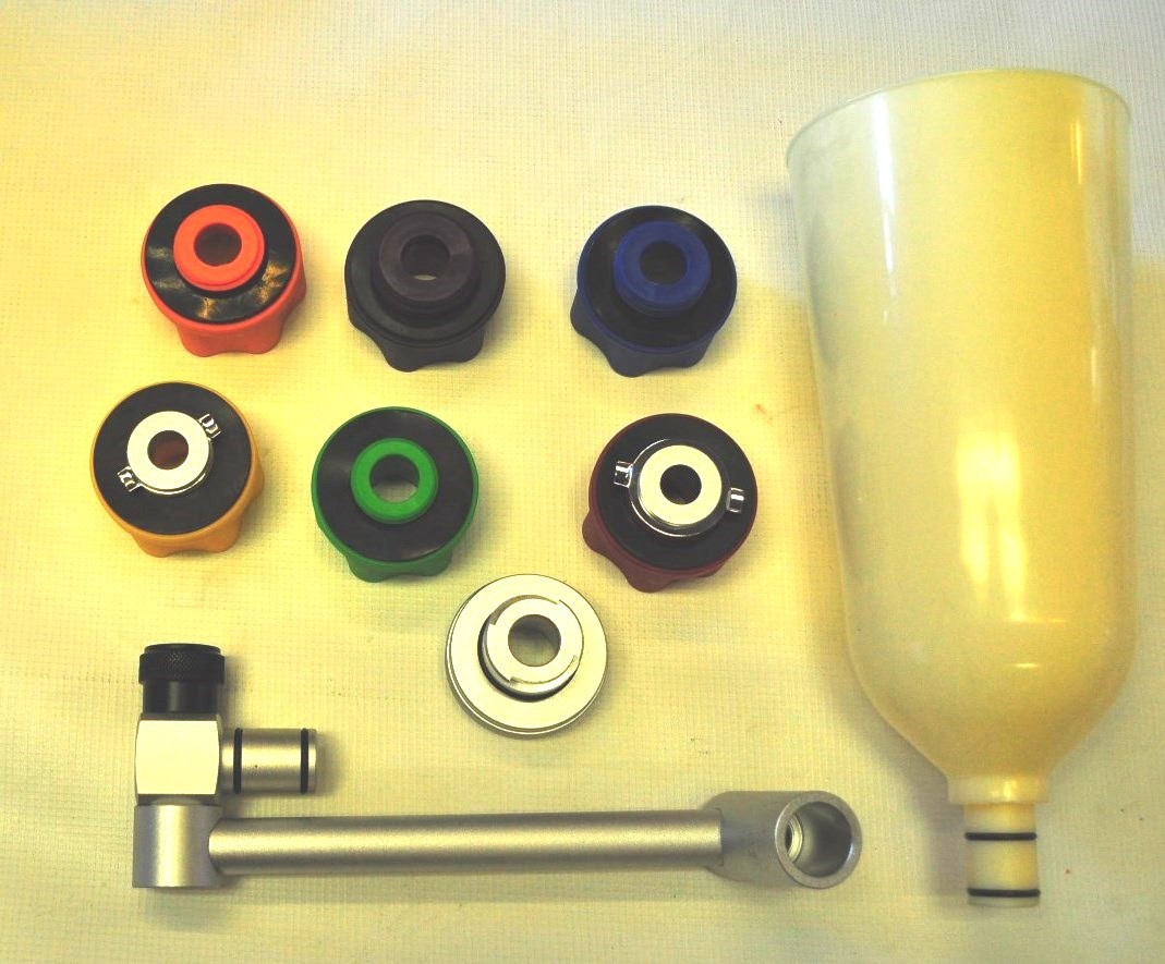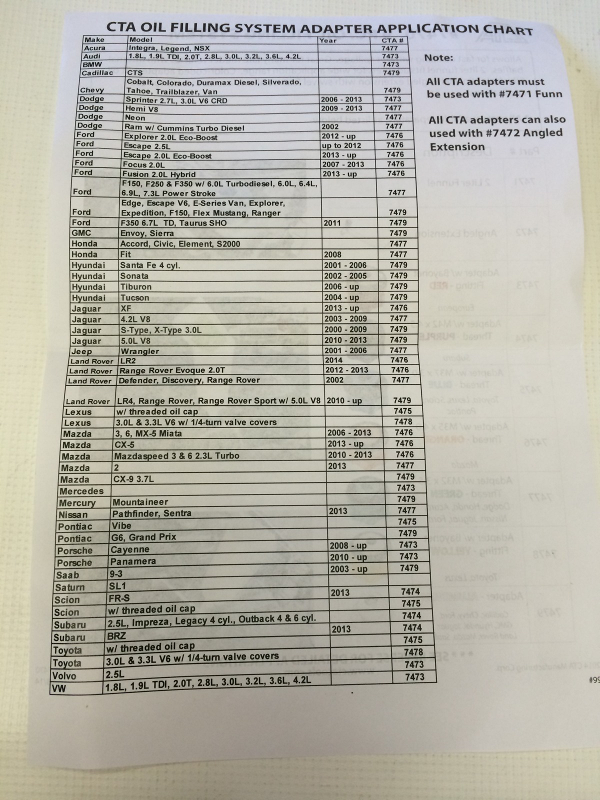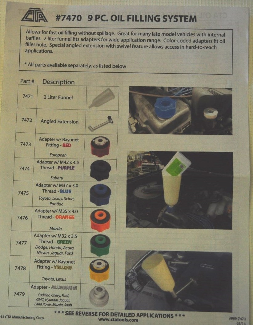 Allows for fast oil filling without spillage. Great for many late model vehicles with internal baffles. 2 liter funnel fits adapters for wide application range. Color-coded adapters fi t oil filler hole. Special angled extension with swivel feature allows access in hard-to-reach applications. All parts available separately, as listed below.