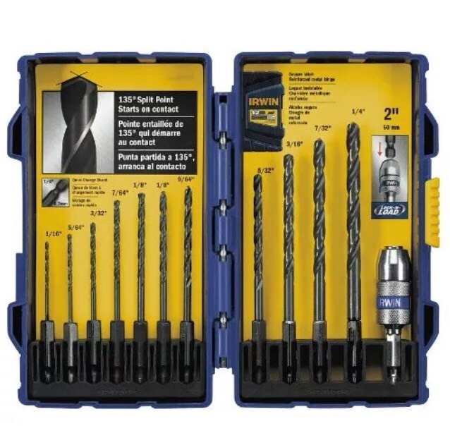 1/4″ Black Oxide Hex Shank Drill Bit Set is designed to work with todays 1/4″ quick change chucks and extensions. The drill bits are made of premium high speed steel with a black oxide finish for added corrosion resistance, and have a 135-degree split point that eliminates “walking” and reduces feed pressure for easier penetration. Bits are ideal for drilling mild steel, sheet metal, alloy steel, aluminum, stainless steel, wood and plastics, and are also compatible with quick-change impact drivers. Set contains sizes 1/16″, 5/64″, 3/32″, 7/64″, 1/8″ (2), 9/64″, 5/32″, 3/16″, 7/32″ and 1/4″, plus a Lock-n-Load 1/4″ quick change extension. The IRWIN Tools 4935643 1/4″ Black Oxide Hex Shank Drill Bit Set comes in a durable molded plastic case for convenient storage and portability.