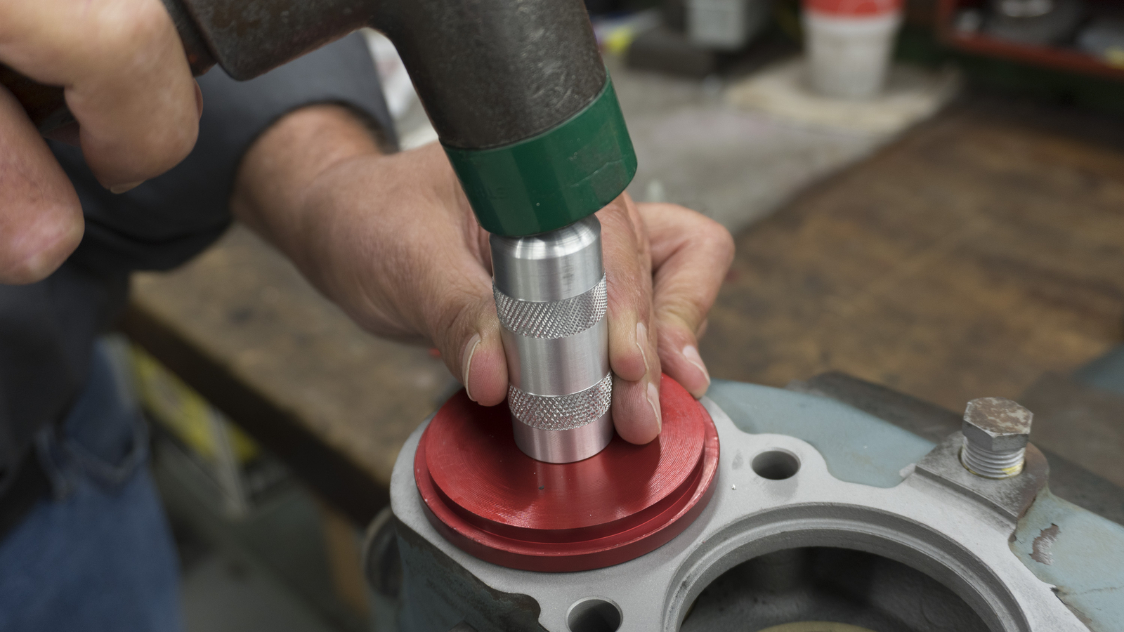 Die doppelseitige Zentrierbuchse führt den Dichtungstreiber so, dass die Dichtungen problemlos direkt in die Aussparung im Thermostatgehäuse eingesetzt werden können. Bei Dichtungen ohne Anschlagflansch dient der Griff als Anschlag, um die Dichtung in der richtigen Tiefe im Gehäuse zu installieren.