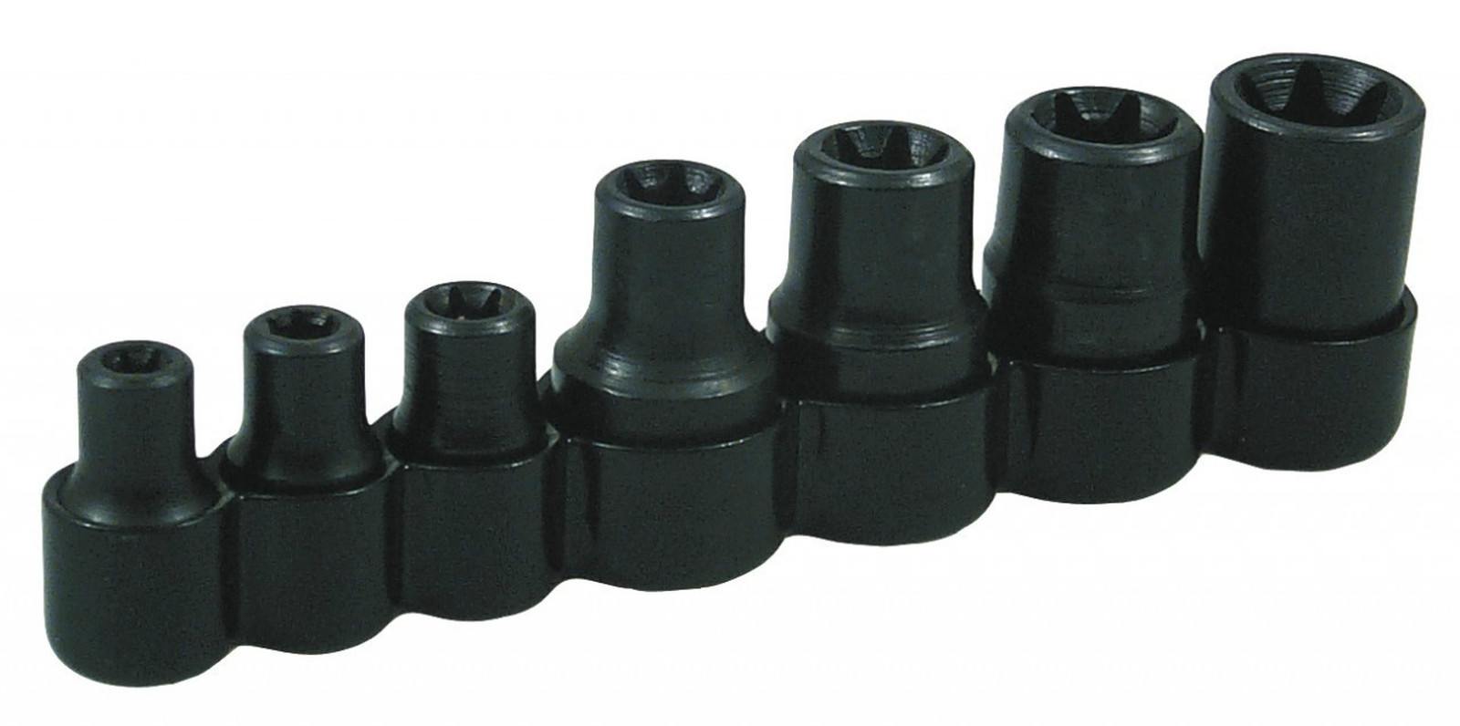 Seven sizes E-6 thru E-16. The three smaller sizes are 1/4″ drive; the four larger sizes are 3/8″ drive.