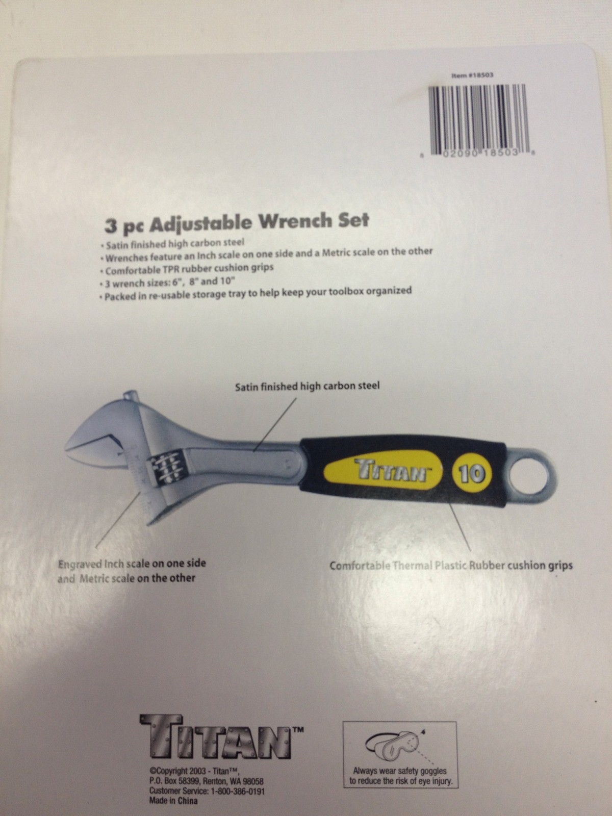 TITAN 18503 3 piece adjustable wrench set with comfortable rubber cushion grips